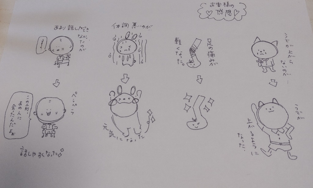 セラピーをする事で精神的に心も整えられて来ますので当初来られた時の様子と変化して血色がよくなり雰囲気も明るくなります。